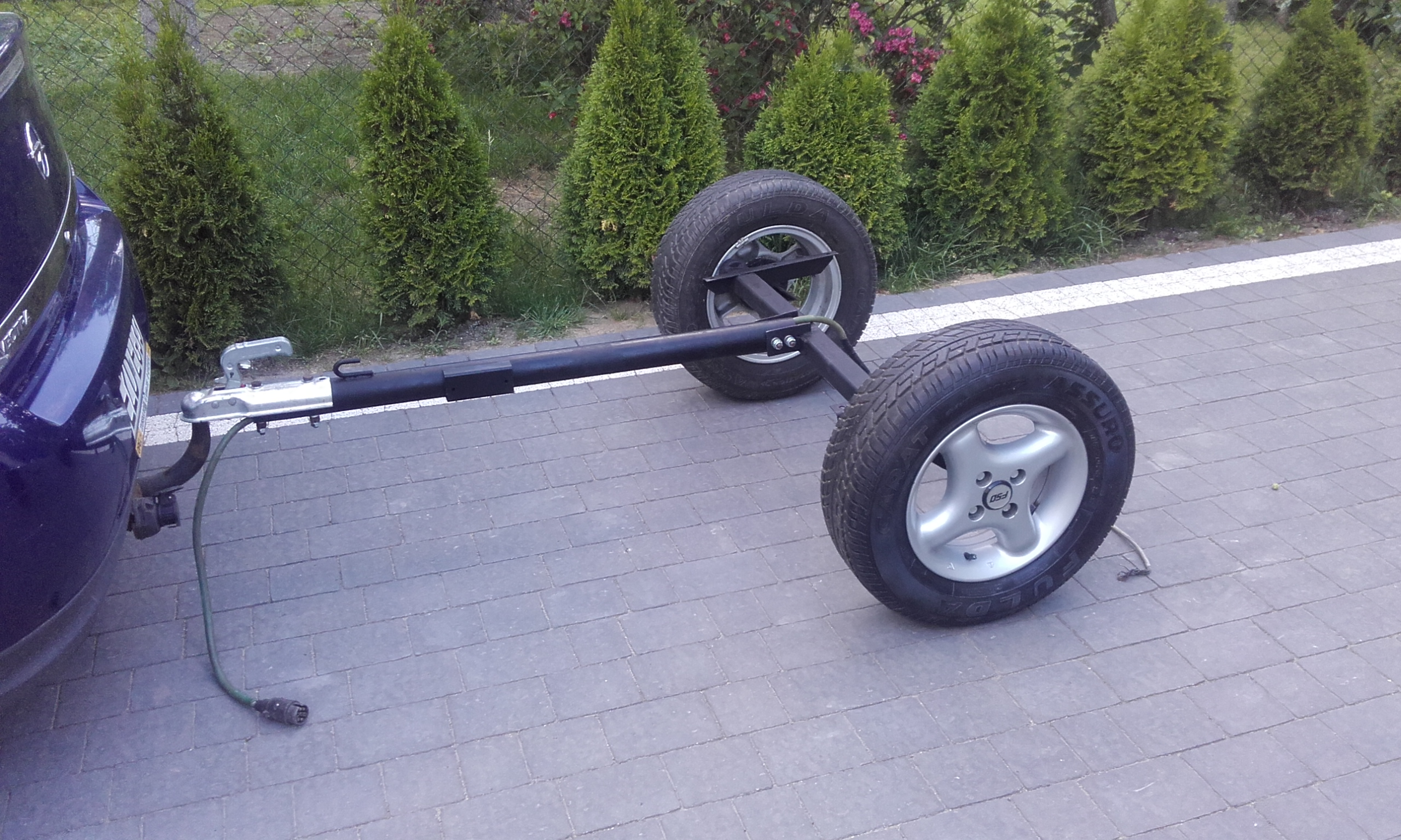Na początek zmontowana "rama" przyczepy na kołach z przeciągniętym przewodem przez dyszel.