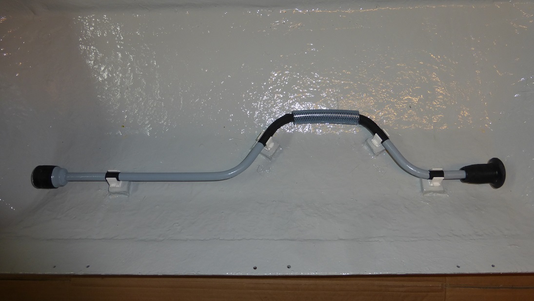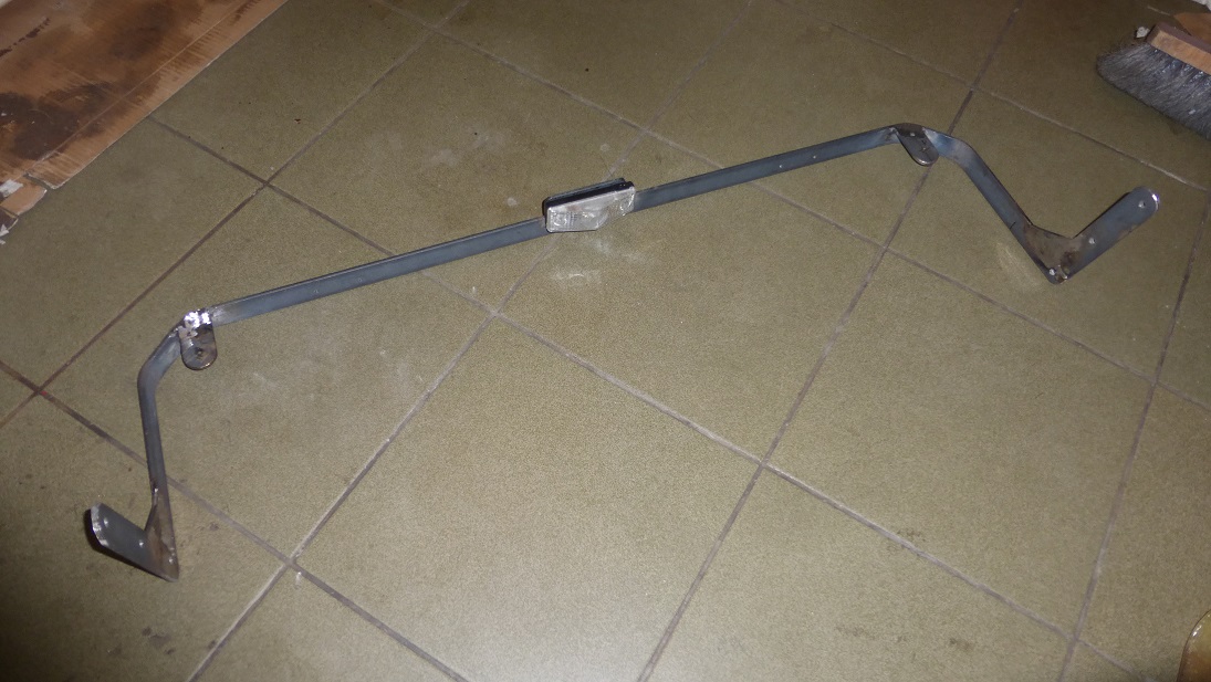 Wczorajsza robota to ostatnia już zabawa z żelastwem czyli stelaż pod butle. Jak wspomniałem wcześniej, ma on zapewnić delikatne pochylenie butli aby w górnej części nie znajdowała się niebezpiecznie blisko ściany przyczepy no i nie kolidowała z wklejoną w kufer siatką. Do budowy posłużył płaskownik taki jak do górnego pałąka, kątownik (też 30mm) oraz pręt gładki fi 8mm. Wyszło coś takiego, tak jakby ruszt. Pręty są po to aby butle można było porządnie zamocować przy pomocy pasów. Dzięki takiej konstrukcji butlę można postawić i przymocować w dowolnym miejscu kufra.