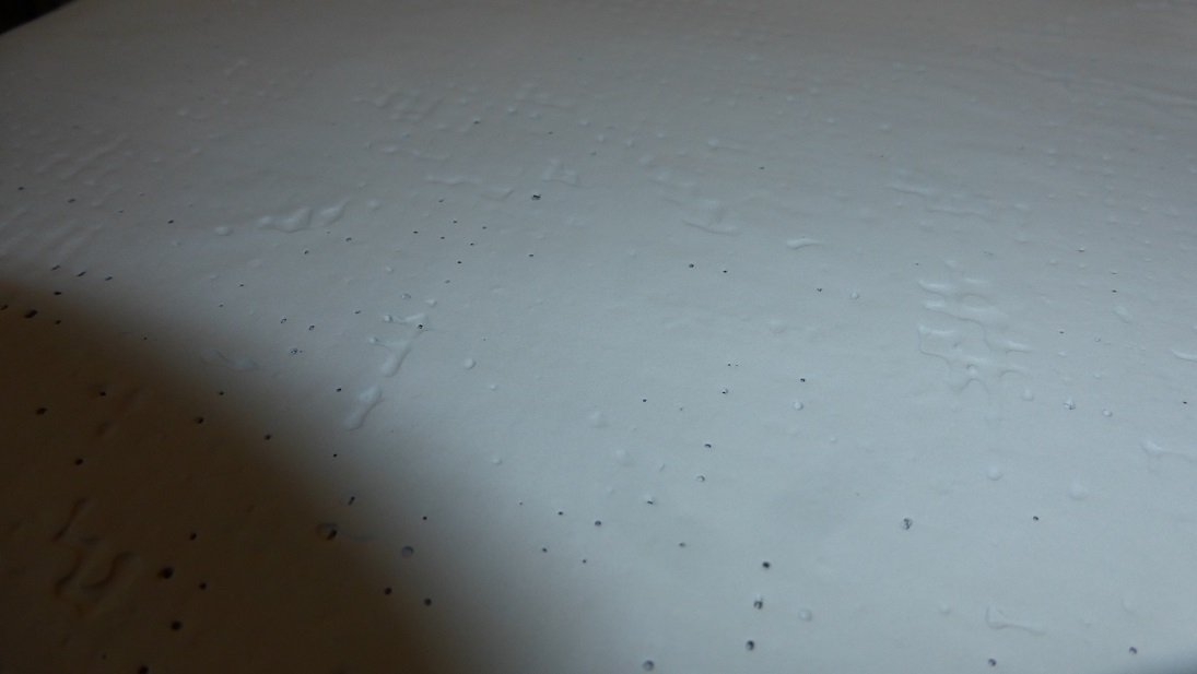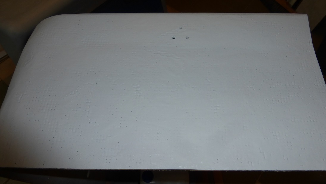 A więc po zmatowieniu powierzchni pociągnąłem wszystko podkładem epoksydowym w sprayu. Dopiero wtedy uwidoczniły się nierówności i zdecydowałem się na szpachlowanie. Tworzenie na płaskiej płycie i papierze do pieczenia zdało egzamin ale do eleganckiej, gładkiej powierzchni sporo brakowało więc położyłem nieco kitu