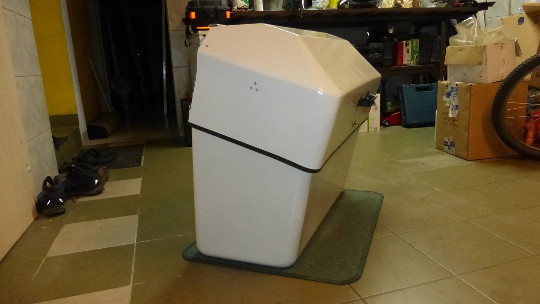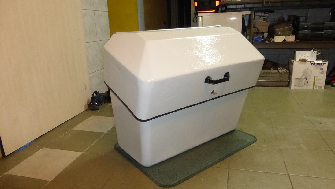 Później cały kufer pomalowałem polecaną na forum dwuskładnikową, poliuretanową farbą jachtową Oliva Emapur Marina, wybrałem kolor jasny szary RAL7035. Tu muszę powiedzieć, że farba kompletnie mnie zaskoczyła bo choć słyszałem o niej sporo dobrego to nie spodziewałem się, że jest aż tak dobra. Krycie jest fenomenalne jak dla mnie, czyli laika w temacie lakierowania. Farba po prostu klei się do powierzchni a nakładanie to sama przyjemność. Nanosiłem małym wałkiem gąbkowym a w nielicznych zakamarkach pędzelkiem. Poszły dwie warstwy na wszystko, jedynie spód kubła mający kontakt z dyszlem machnąłem trzykrotnie. Nie używałem rozcieńczalnika, jedynie mieszałem emalię z utwardzaczem w podanych na puszce proporcjach. Polecam robić to przy użyciu strzykawki 20 ml, idealnie mieści się w otwór puszki utwardzacza i pozwala na dokładne odmierzenie proporcji a to w tym przypadku podobno bardzo ważne, tak jak pozostawienie mieszaniny na kwadrans od momentu dodania utwardzacza i rozpoczęcie malowania dopiero po tym czasie.