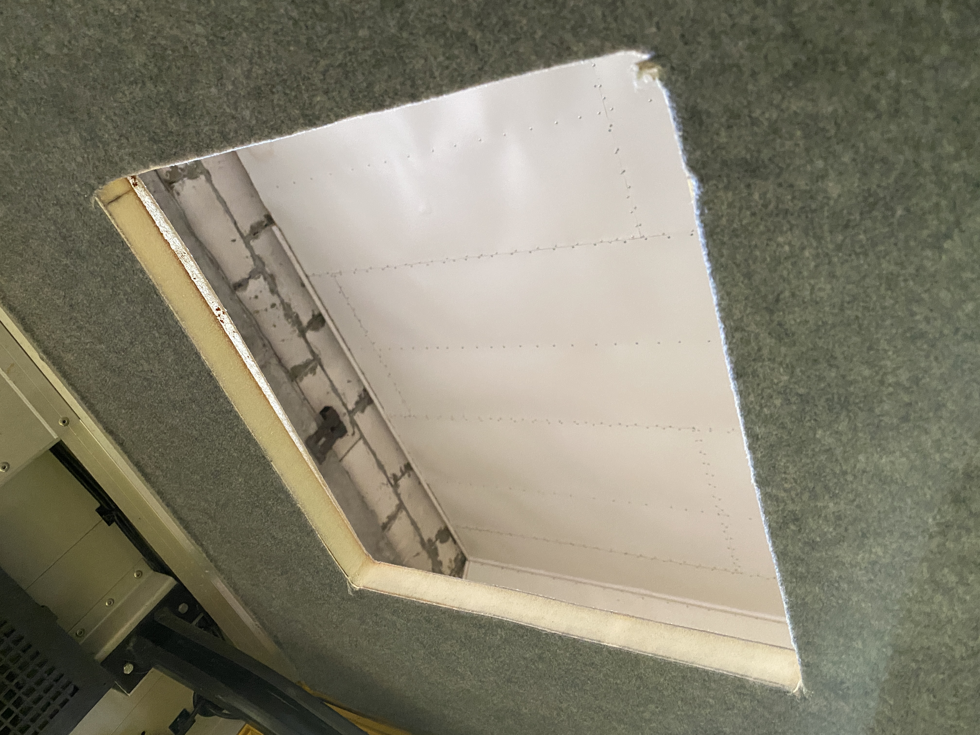 Kolejny etap prac - dach i okno dachowe. Dach w pocztowcu jest wykonany w tej samej technologii, co ściany (z wyjątkiem świetlika, gdzie jest pojedyncza warstwa laminatu). Niestety, z biegiem lat zewnętrzna warstwa laminatu odwarstwia się od pianki stanowiącej rdzeń płyty sandwich dachowej. Ulega ona pofałdowaniu. Dach w zasadzie jest szczelny, ale wierzchnia warstwa ma mikropęknięcia, jest pofałdowana.