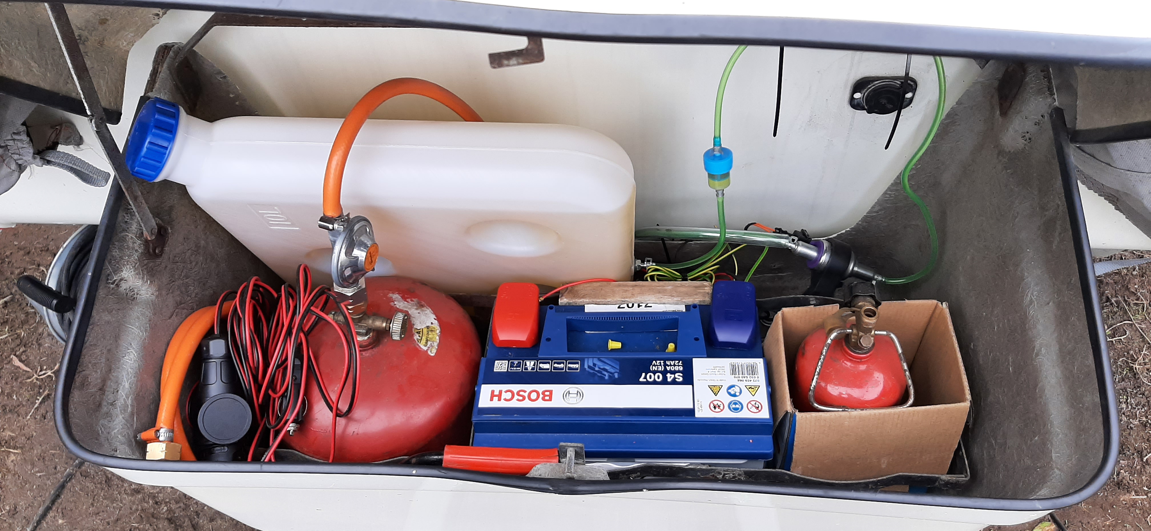 Na pewno skorzystam z zaproszenia. A na początek może być schemat podłączenia. U mnie wygląda to tak, w bakiście centrum zasilania, natomiast vebasto w przyczepie pod małym siedzeniem. Wylot od vebasta jest skrócony tak żeby rozkładać łóżko. Zastanawiam się jak podłączać ładowarkę, bo klemy mam zamykane z osłonami więc brak dostępu.
