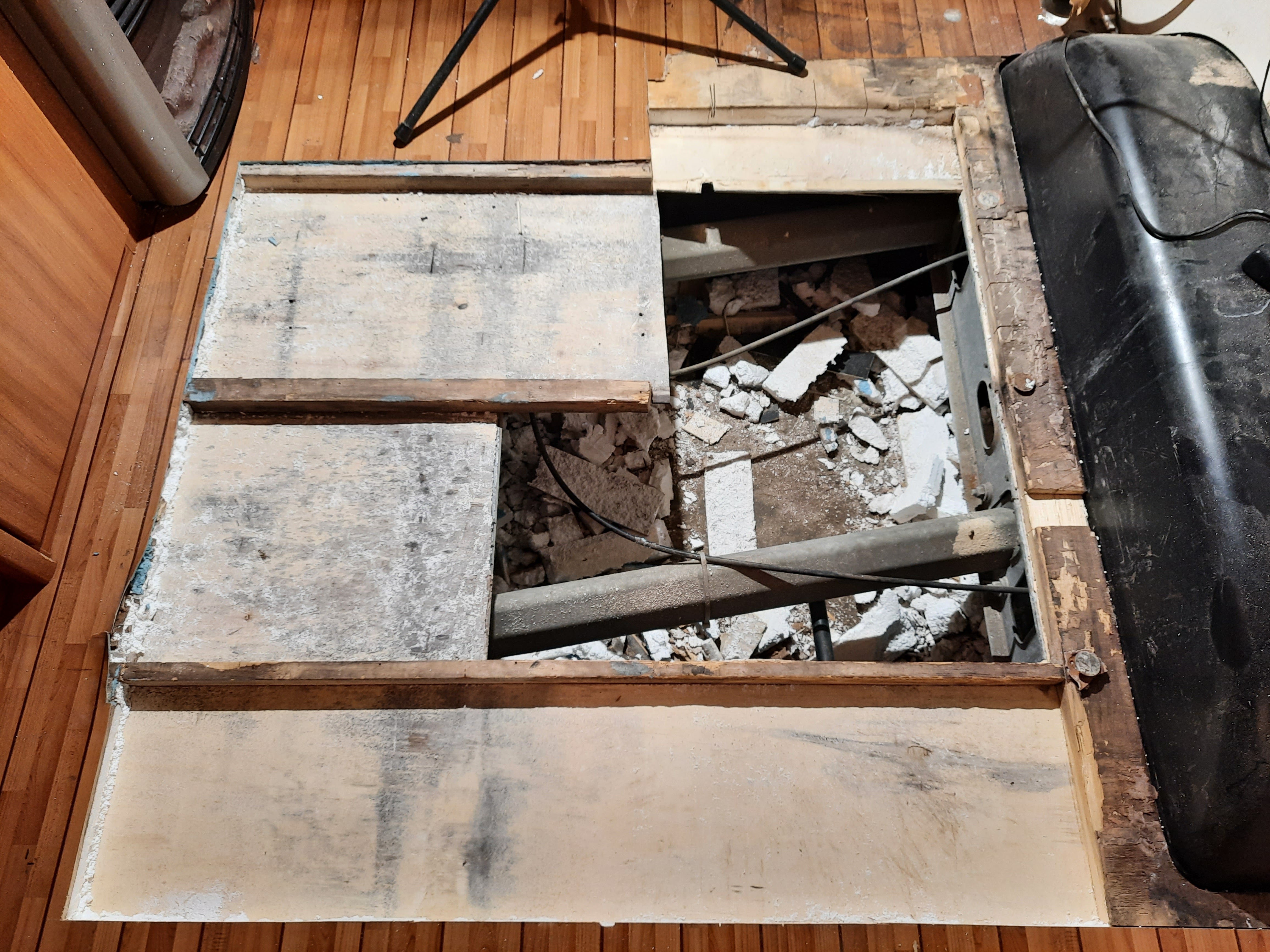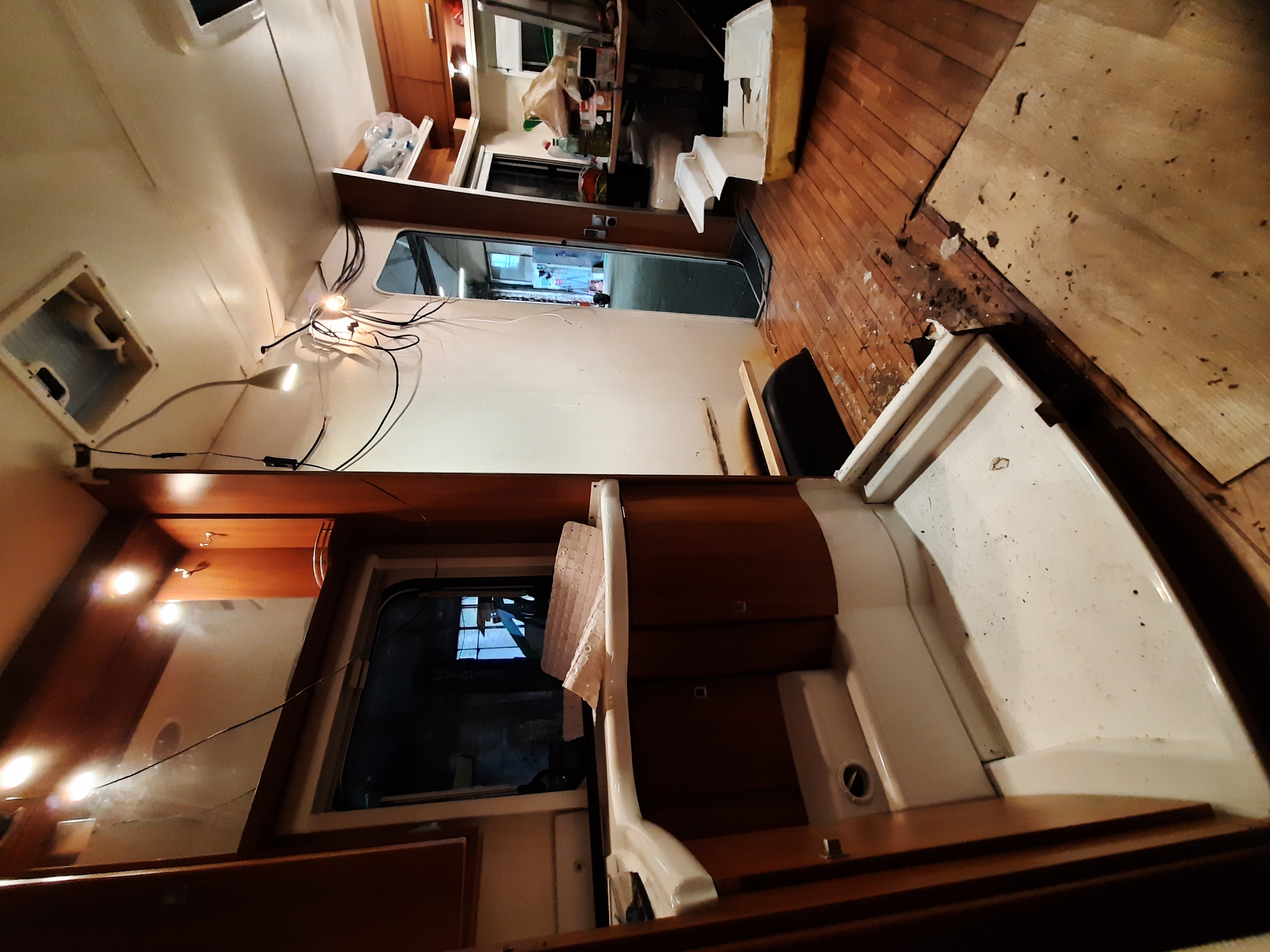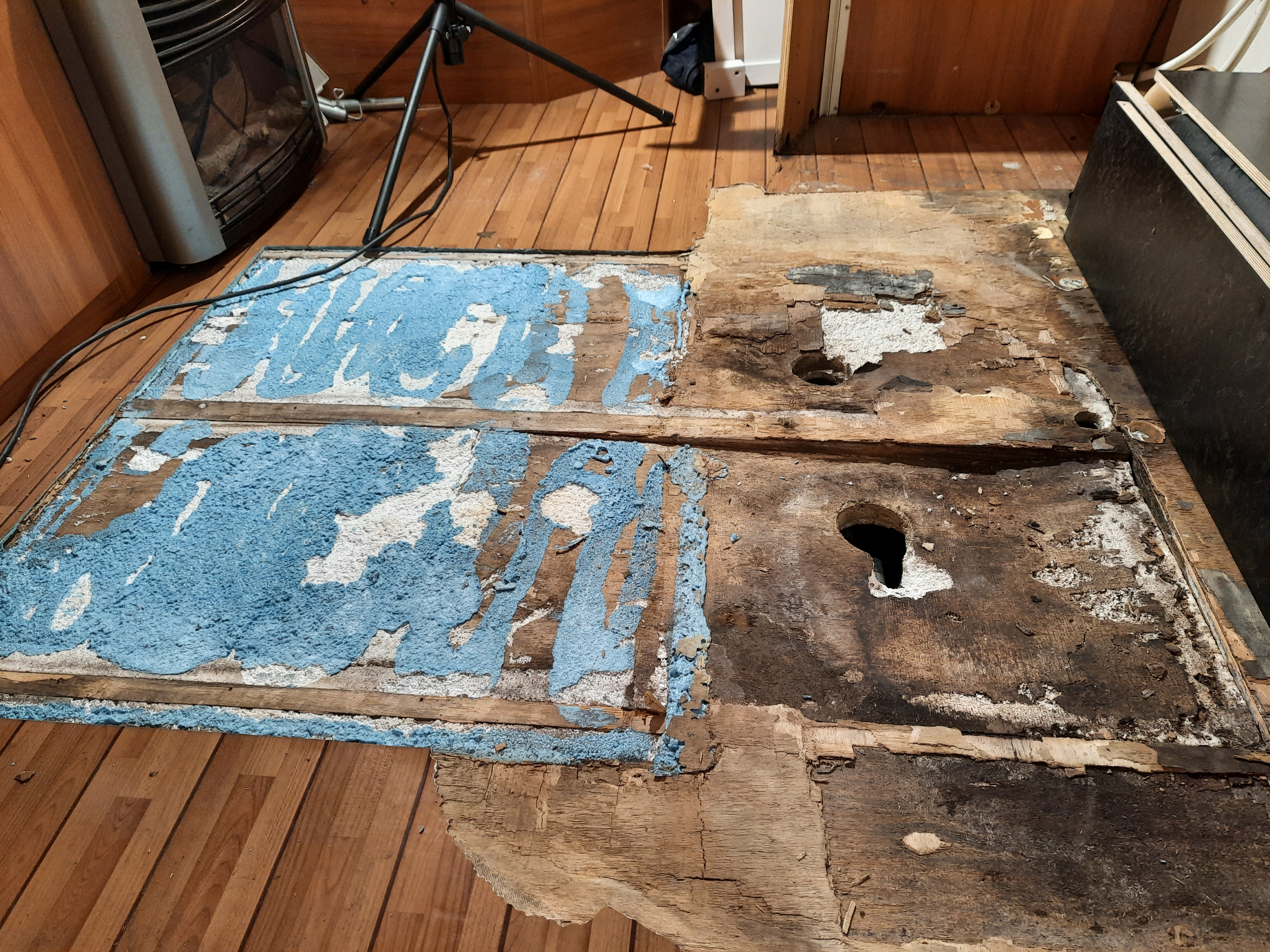 Nie pozostało nic innego jak wyciąć uszkodzone fragmenty podłogi. Ponieważ część uszkodzeń dotyczyła całej grubości podłogi (to ten zapadnięty fragment), część tylko sklejki górnej warstwy musiałem usunąć również izolacje (styropian), aby dojść do "zdrowej" dolnej sklejki. Całość "sinej" sklejki zostanie usunięta i wymieniona na nową. Podobnie stelaż z kantówek.