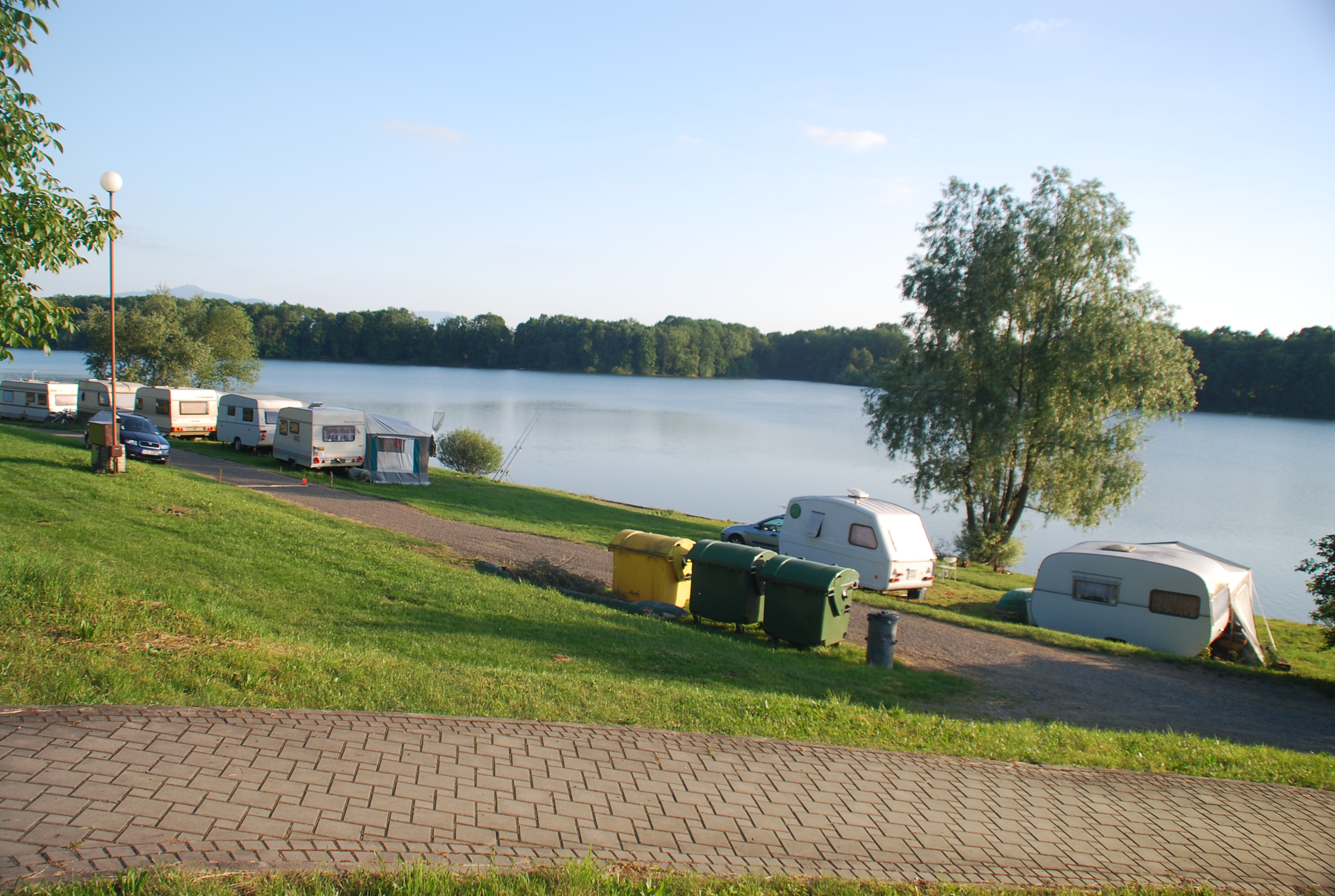 Można rozłożyć się nad samą wodą. Im bliżej weekendu tym więcej ludzi. Na terenie kempingu plac zabaw, WC i prysznice, dostęp do bieżącej wody. Skrzynki z przyłączem elektrycznym dosyć gęsto rozłożone. W sezonie, (początkiem czerwca głównie na weekendy) na terenie jest bar ze świetnym czeskim piwem, jakimiś zakąskami itd. Jest też mniejsza budka typu fast-food (również z piwem)