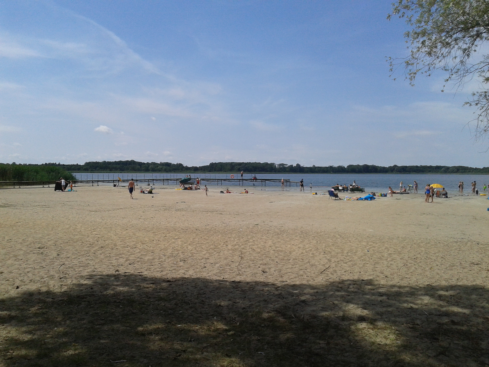 Na terenie samego ośrodka sklepik całkiem dobrze zaopatrzony i przyzwoitymi cenami (0,5 l wody rozmownej droższe o 5 zł niż w markecie), czynny do późna (23-24 w nocy). 4 (słownie cztery mimo, że na fotkach tylko 2) bary z zimnymi piwkiem i jakimś jedzeniem i fastfoodami (tu nic nie powiem, bo żywiliśmy się samodzielnie) Jakieś atrakcje dla dzieci typu rowerki, czterokołowce, 2 place zabaw i nawet mini wesołe miasteczko z karuzelami i dmuchańcami no i oczywiście plaża. Plaża w zamyśle przygotowana bardzo dobrze, bo wysypana piachem dość daleko w jezioro żeby było miło chodzić po piasku a nie po mule. Niestety obecnie większość tego wysypanego piasku stanowi plażę, ponieważ stan wody jest bardzo niski i jest to problem w bardzo wielu miejscach. Jak mówili tambylcy to woda sięgała prawie do miejsca z którego zrobiłem zdjęcie. Woda przywozicie czysta jak widać.