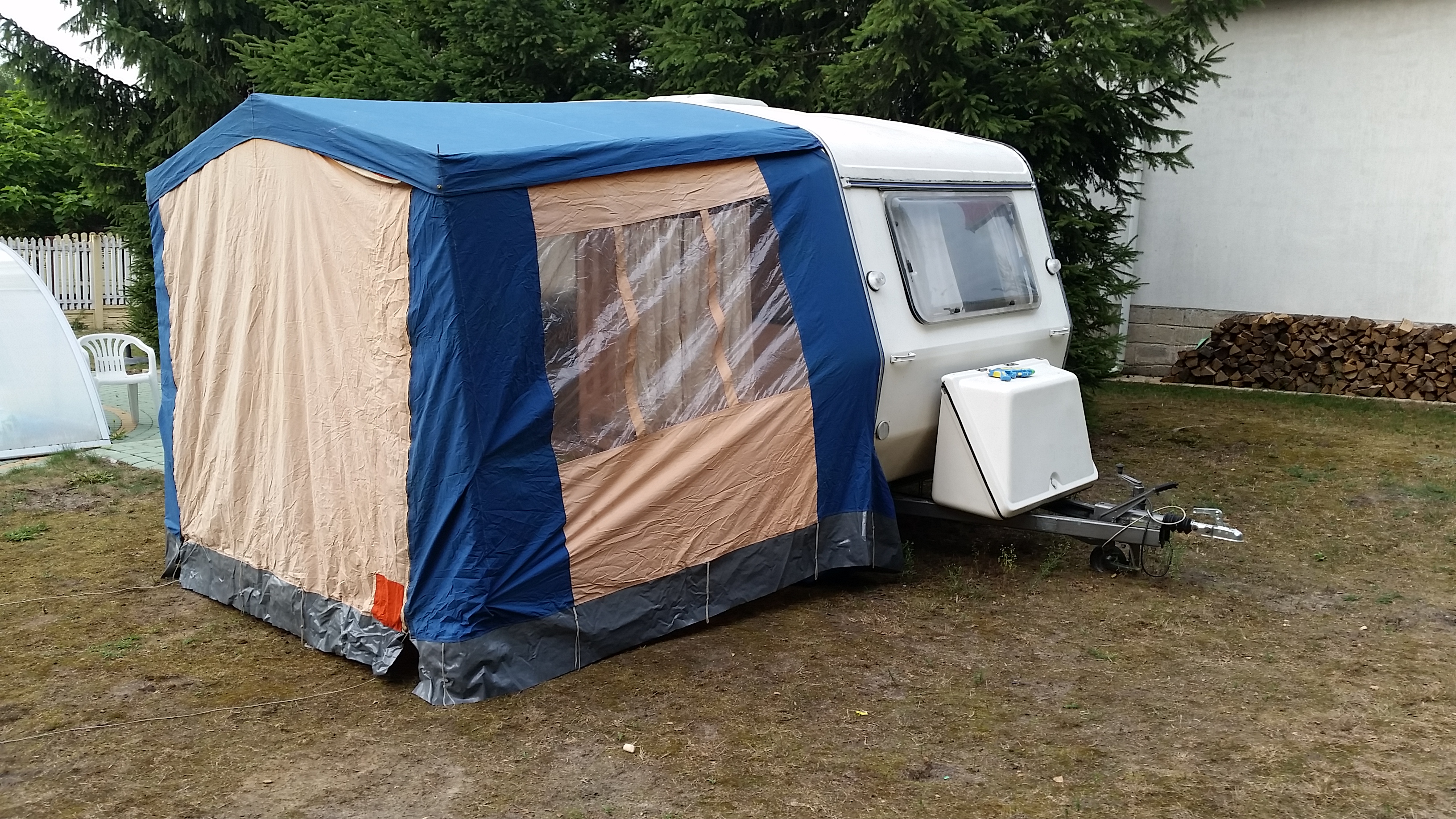 Jak kupiłem swoja cepkę (N), to też miałem przedsionek od "e" i problemem było chodzenie do przyczepy na skos, bo drzwi przedsionka były po drugiej stronie. I mimo, że miał bardzo nieprzemakalny/gumowany dach, to musiałem odsprzedać. Tutaj masz podnoszoną całą ścianę, więc może warto się pobawić. A jak jeszcze doszyjesz jakieś rzepy po bokach dachu/ściany (fot. 1 i 4) i dołożysz ścianki, to masz przedłużony domek