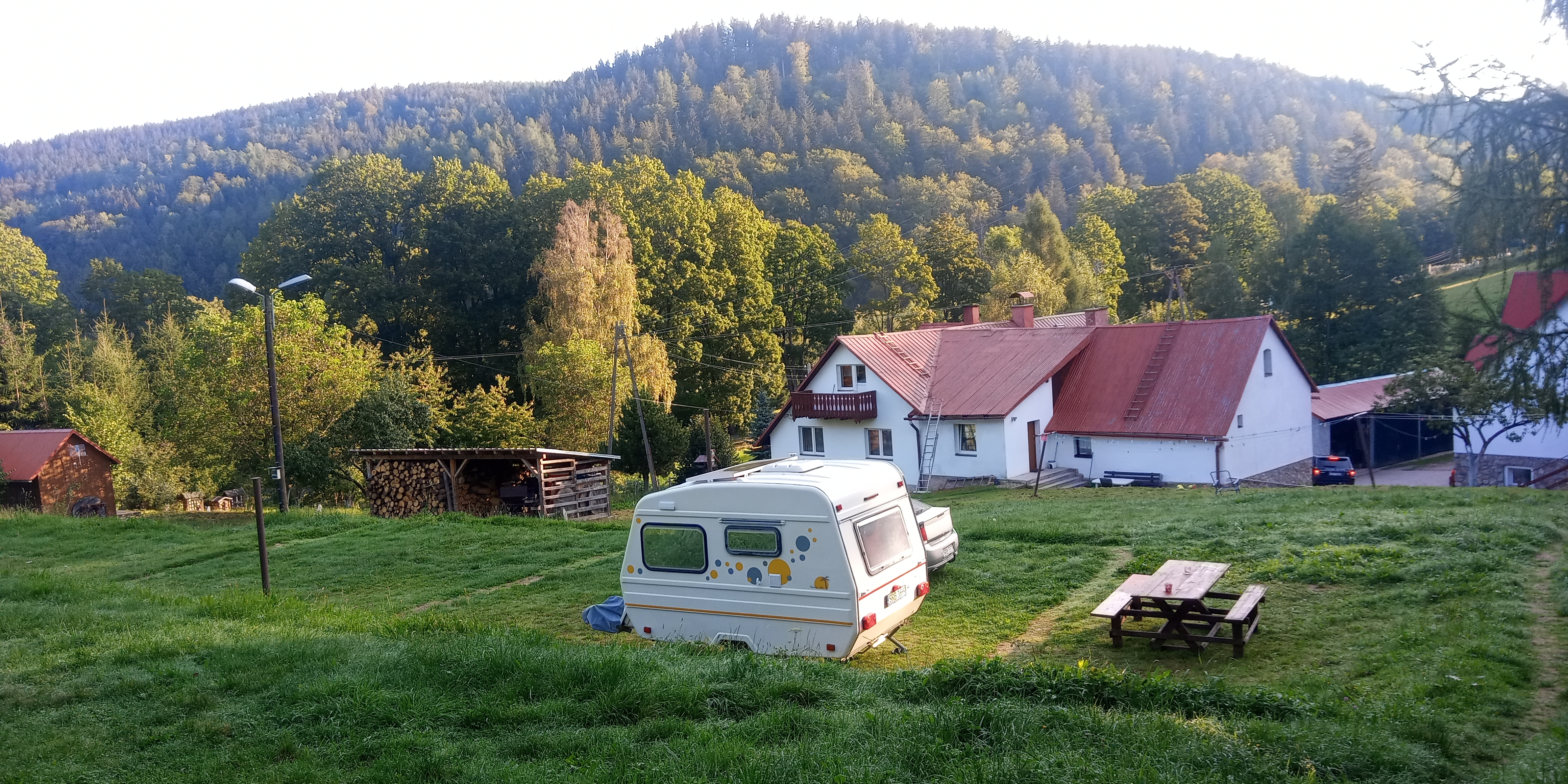 Pole niewielkie w formie trzech tarasów ze względu na nachylenie. Przed przyjazdem wskazane skontaktować się w sprawie wolnego miejsca. O ile z namiotem można rozbić się wszędzie to z przyczepą już jest gorzej.Na terenie pola do wynajęcia 2 domki i pokoje w domu właściciela. Sanitariaty ok w budynku poniżej: 2 łazienki z prysznicem i w pełni wyposażona kuchnia( piec,czajniki,zlew,płyn do naczyń,sztućce,naczynia,stół,krzesła,lodówka z zamrażarką) Na polu jeden słup z gniazdkami ale w nocy ciemno. W łazienkach woda ciepła/gorąca całą dobę. Są jeszcze mobilne 3 ławostoły. Pole posiada fajną stronę internetową więc dorzucę tylko 2 foty. Cena to 20zł za osobę plus ewentualnie dycha za prąd i to wszystko.