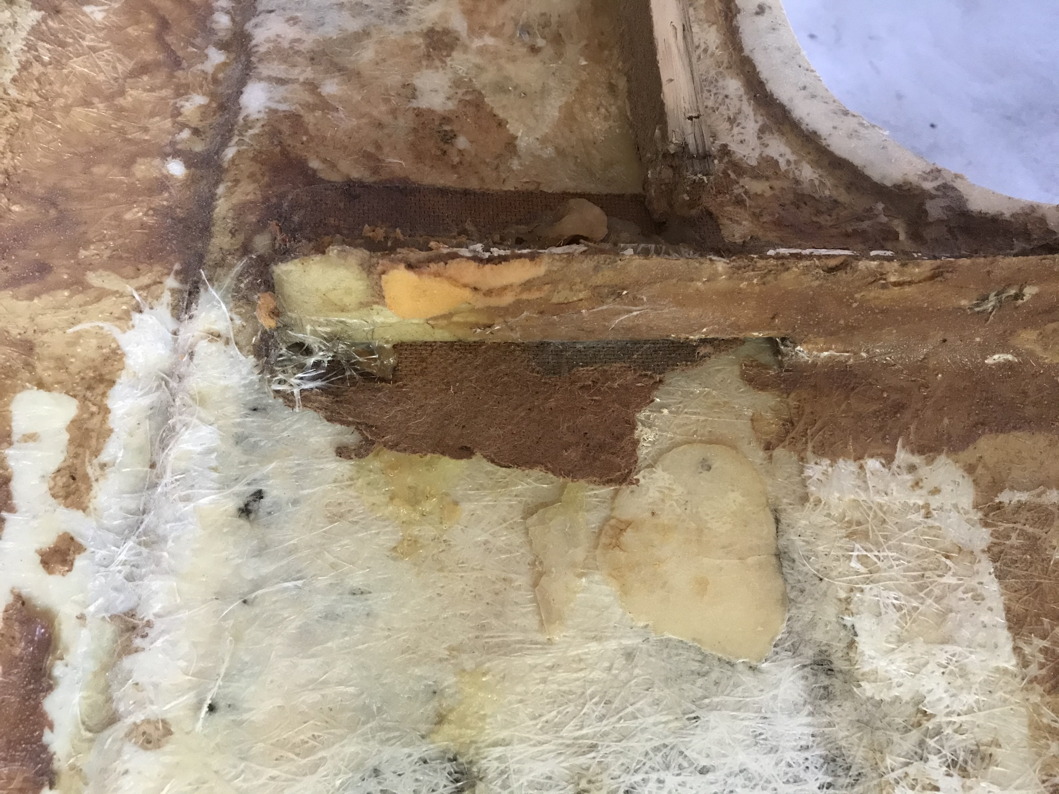 3. Zastanawiam się co zrobić z tą belką? Pod nią jest jakaś płyta, której ciężko się pozbyć. Widzę, że jest zalaminowana wielką matą z włókna. Jakieś pomysły? Wyciąć całość?
