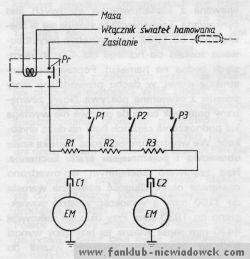 Schemat elektryczny tego hamulca przestawiono na rys. 1. Sygnałem do uruchomienia szczęk jest naciśnięcie pedału hamulca w samochodzie. Powoduje to doprowadzenie napięcia nie tylko do świateł "stop" przyczepy, ale i do regulatora siły hamowania. Przy łagodnym hamowaniu na poziomej drodze po włączeniu przekaźnika prąd płynie do elektromagnesów EM poprzez trzy szeregowo połączone oporniki. Spadek napięcia na nich powoduje, że w tych warunkach hamowanie jest łagodne. W układzie znajdują się jednak dodatkowo trzy włączniki bezwładnościowe. Każdy z nich składa się z rurki z umieszczoną w górnej części parą styków (rys. 2).
