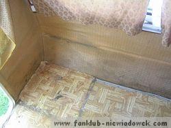 Po wielu konsultacjach i poszukiwaniach w internecie doszedłem do wniosku że najlepszym (i zarazem najtańszym) będzie oklejenie przyczepki wykładziną podłogową - oczywiście po uprzednim zerwaniu starej tapicerki. W celu ułatwienia sobie pracy postanowiłem wymontować wszystkie meble z wnętrza przyczepki i na pierwszy ogień poszło mniejsze łóżko (te zaraz przy wejściu).