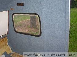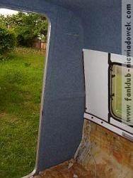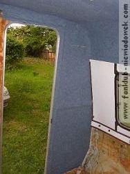 Porozkładałem na ziemi wszystkie kawałki starej tapicerki i pomierzyłem - wyszło około 20m2, postanowiłem że kupie 30m2 aby się nie martwić o odpady i ciąć na luzie (jak coś zostanie to zawsze się przyda. Klejenie zacząłem od sufitu który to kleiłem z jednego kawałka (2m na 3m), do sufitu dobrze jest zapewnić sobie pomoc drugiej osoby żeby trzymała wykładzinę. Wystartowałem od przedniej części i jak już miałem szyberdaszek to zaczęła się robić mała fałdka lecz udało mi się przesunąć w miejsce gdzie stoi szafa i tam naciąłem wykładzinę na długości ok 40 cm od ściany (w ten sposób pozbyłem się fałdy i mam pewność że nie będzie widać nacięcia za szafą).Następna była ściana z drzwiami,postanowiłem zrobić ją z dwóch kawałków (granicą były drzwi),najpierw przykleiłem ten mniejszy, a następnie duży z oknem. Podczas całego klejenia smarowałem klejem ścianę lub sufit (nie wykładzinę), co mi pozwoliło zakleić całą ścianę (łącznie z oknem), a dopiero po wyprofilowaniu wykładziny zabrałem się za wycinanie okna. Obróbka okna polega na wycięciu delikatnie mniejszego otworu niż średnica uszczelki i podłożeniu wykładziny pod uszczelkę.