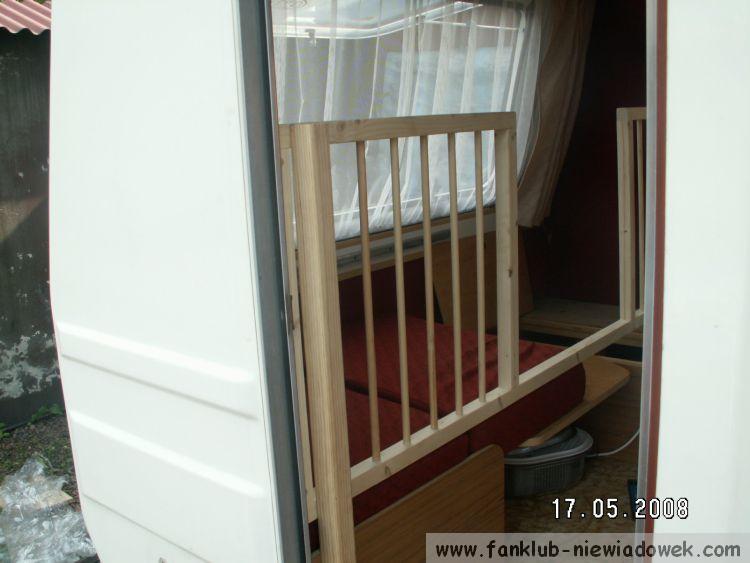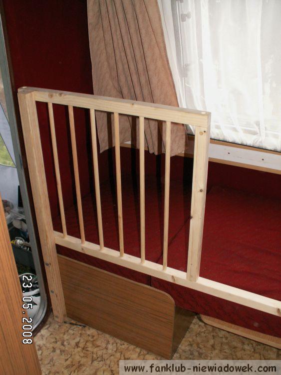 Materiał jaki wykorzystałem do wykonania tego łóżeczka to drzewo - sosna - zakupione w tartaku. Po ściągnięciu wstępnych wymiarów z łóżka w przyczepie, okazało się, że na wykonanie łóżeczka potrzebuje: kantówkę 40/40mm 1 szt o dł 1000 mm, która jest przykręcona przy drzwiach do skrzyni z łóżka trzema śrubami M6 na wylot i 1 szt o dł. 610 mm, która jest przykręcona do szafki kuchennej 2 śrubami M6 na wylot. Wymiary boków ze szczebelkami mają wymiar 650 mm na 600 mm z tym, że furtka jest mniejsza - 590 mm na 600 mm wszystko wykonane z kantówek 30/30 mm z racji, że musiałem jeszcze zmieścic szkobelki do zamykania, oraz zawiasy. Obliczyłem to w taki sposób, aby w każdym płotku weszło po 6 tralek. Furteczka otwiera sie na zewnatrz, z oczywistych powodów. Dzięki takiemu rozwiazaniu nie muszę się obawiać, że córeczka może spaść w czasie snu, i jest to doskonałe miejsce do przechowywania zabawek dziecka.