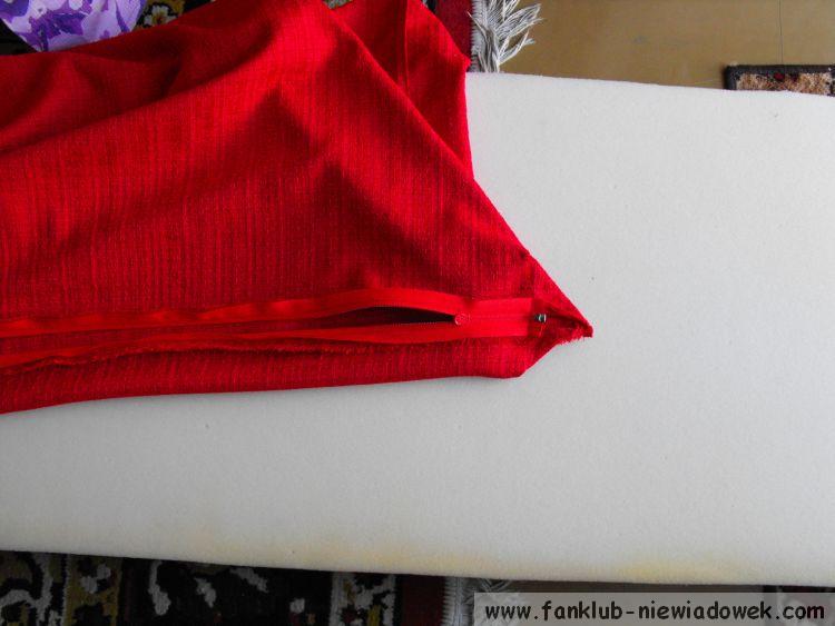 Dobrze jest jak materiał ma 1,20 m szer. wtedy (przy materacach szer. 50cm i gr. 10cm) nie potrzeba obcinać tylko kupuje się odpowiednią długość (dł. 4 dużych + 4 mniejszych + boki) i dobrze jest jak jest miękki i elastyczny, bo się dobrze szyje i układa. Pokrowiec powinien być taki jak gąbka lub minimalnie mniejszy, wtedy się ładnie naciągnie. Zamek (o dł. dłuższego boku lub 2 mniejsze rozsuwające się na boki) przyszywamy prawą stroną do prawej strony materiału.